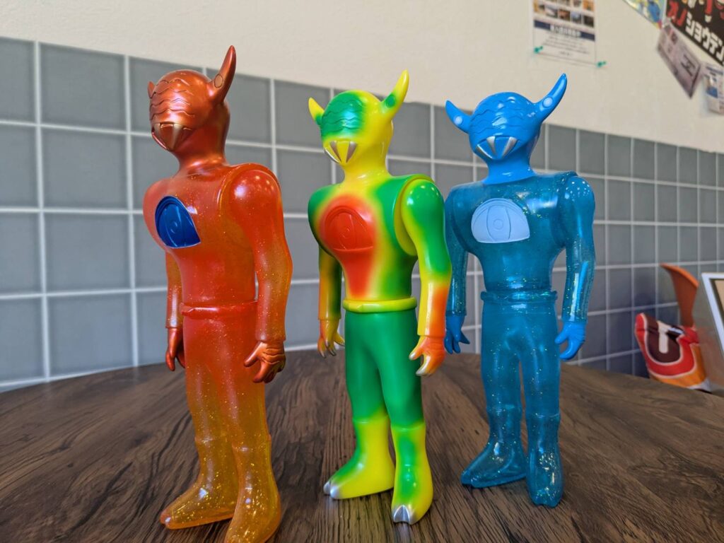 「甲府UFO事件」で現れた甲府星人をモチーフにしたアイテムも多数販売中です。甲府星人で地域振興されている一般社団法人「UFOKOFU1975」のオリジナルグッズ、甲府星人のPR第一人者のザクレスホビーさんによる“甲府星人ソフビ人形”も、山梨ではオノショウテンだけで販売をしています。