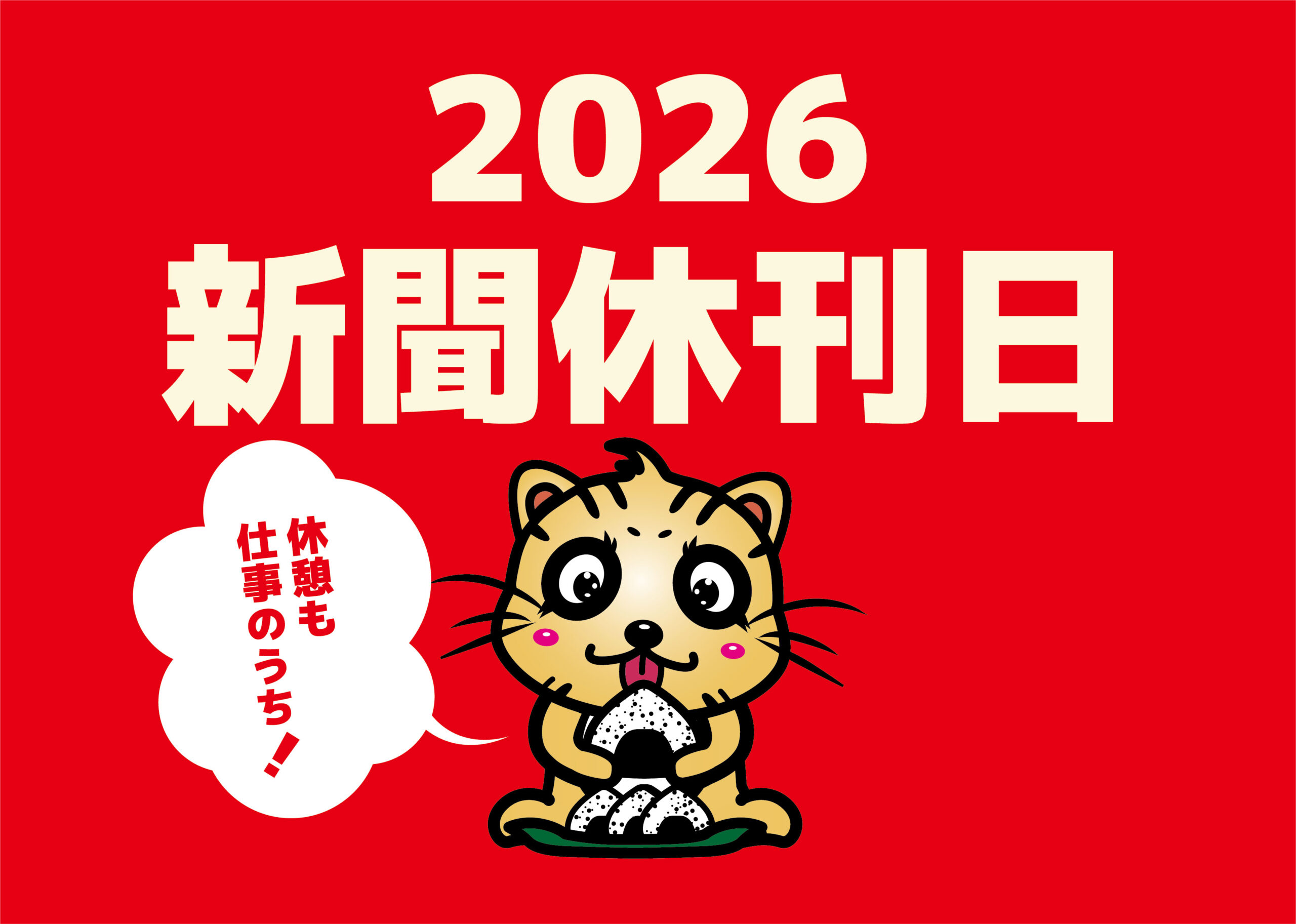 PR2026.01.01「2026年 新聞休刊日」について ポスト シェア 送る 2026年の新聞休刊日 今年2026年の新聞のお休みの日(新聞休刊日)は下記の通りです。なお、選挙や社会事情により休刊日が変更になる場合がございます。 1月2日(金)2月9日(月)3月16日(月)4月13日(月)5月11日(月)6月15日(月)7月13日(月)8月12日(水)9月14日(月)10月13日(火)11月9日(月)12月14日(月)